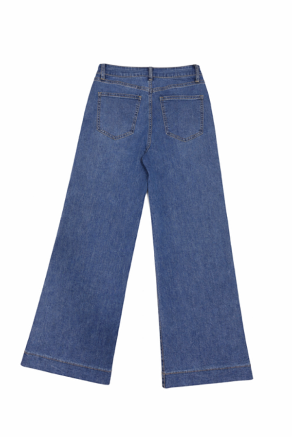 Jeans em tom de azul médio, modelo straight super confortáveis.